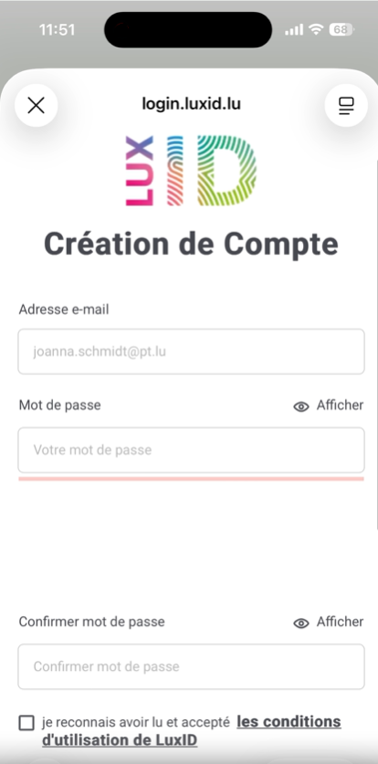 Cochez ensuite la case « Je reconnais avoir lu et accepté les conditions d’utilisation de LuxID », puis cliquez sur « Créer votre compte ».