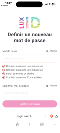 Vous êtes redirigé vers la page LuxID pour définir votre nouveau mot de passe. Cliquez ensuite sur « Modifier le mot de passe ».